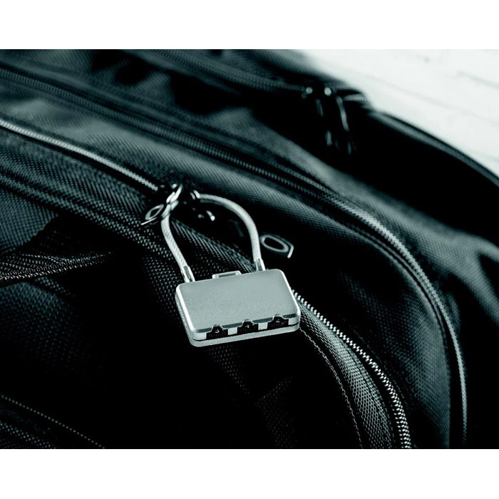 Zabezpieczenie bagażu w postaci kłódki metalowej z 3 kombinacjami kodu zabezpieczającego.