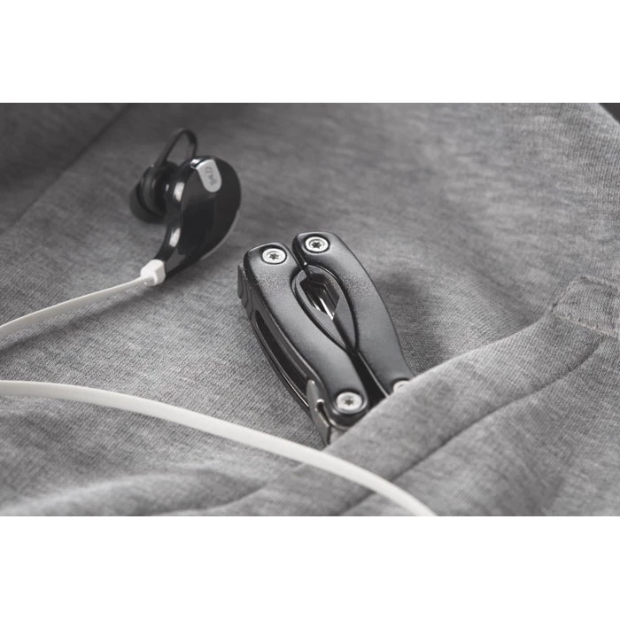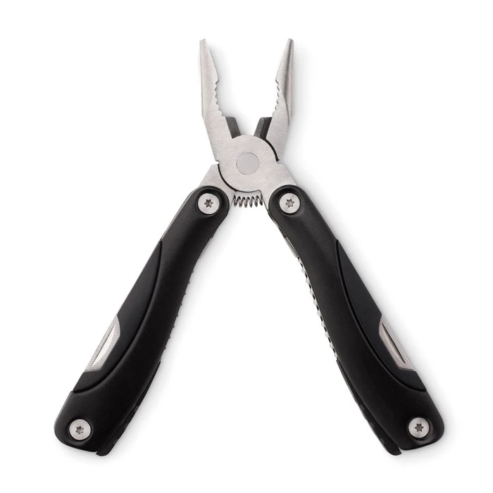 Składany wielofunkcyjny nóż ze stali nierdzewnej. 9 narzędzi funkcyjnych z ABS. Zapakowany w etui z poliestru 600D.
