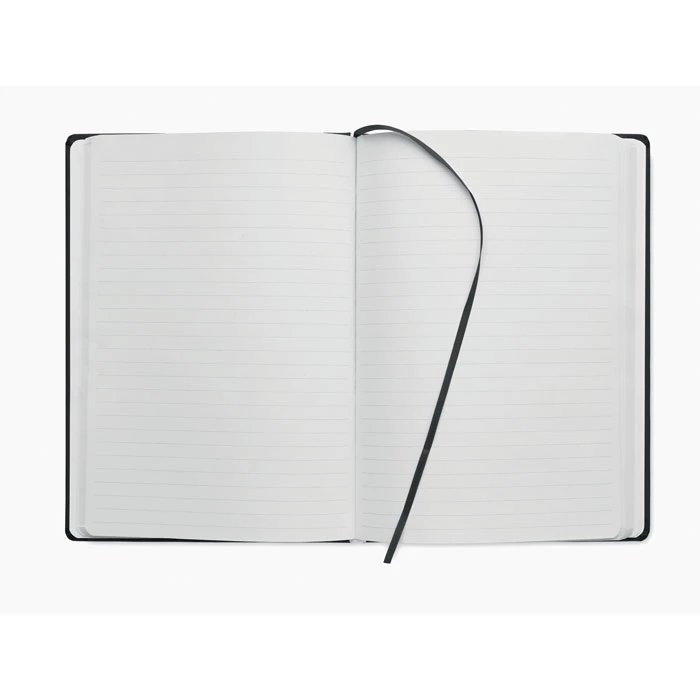 Notatnik A5 z twardą okładką z PU. 200 strony w linie (100 kartek) z papieru z recyklingu (80 g/m²). Dopasowana gumka zamykająca i tasiemka do zaznaczania stron. Wyprodukowano w UE.