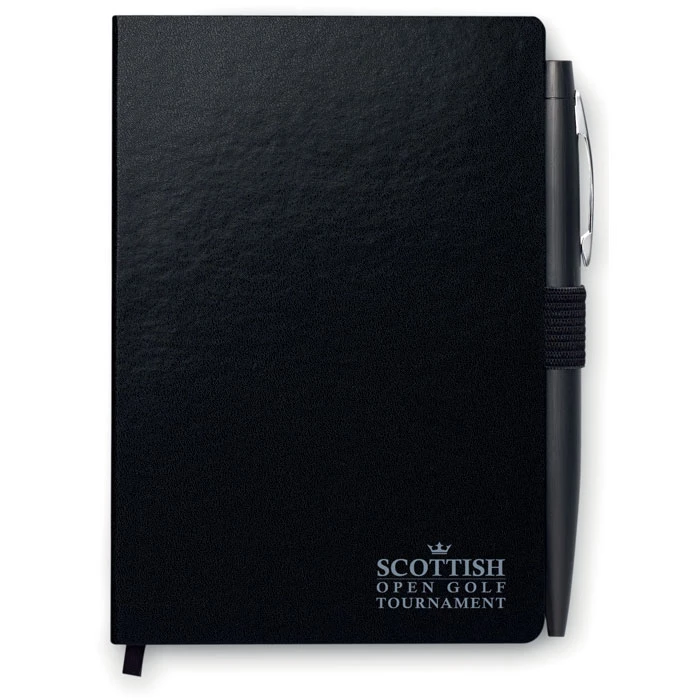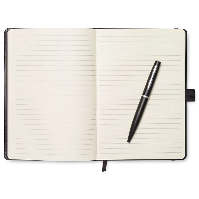 Notes A5 z długopisem. Twarda okładka z PU. 144 strony w linie (72 arkusze). Dopasowany elastyczny pasek zamykający i uchwyt na długopis. Dopasowany metalowy długopis z przyciskiem. Niebieski tusz. FSC MIX CREDIT | P7.1 | FSC-C213206