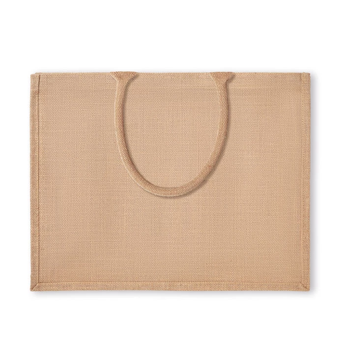 Jutowa laminowana torba na zakupy z krótkimi uchwytami, wykonanymi z bawełny.