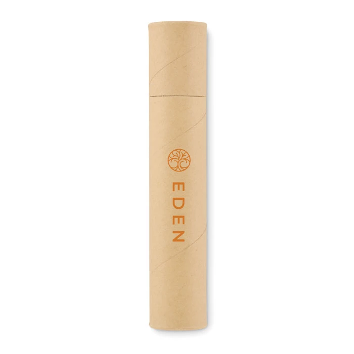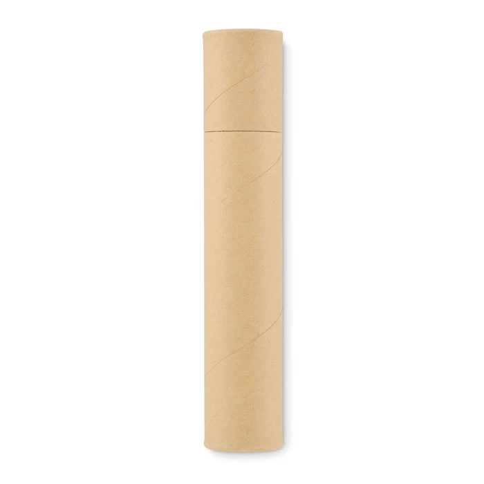 Papierowa tuba zawierająca 2 ołówki, 1 długopis z kartonu, 1 drewnianą temperówkę i 1 gumkę.