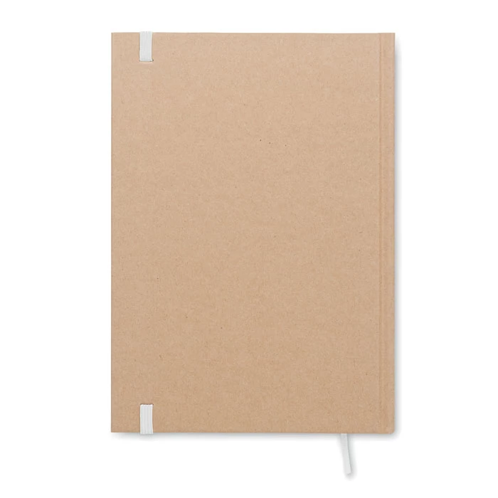 Notatnik A5 w twardej okładce z kartonu z recyklingu. 200 stron w linie z papieru makulaturowego (100 kartek 80 g/m²). Dopasowana gumka zamykająca i tasiemka do oznaczania stron. Made in EU.